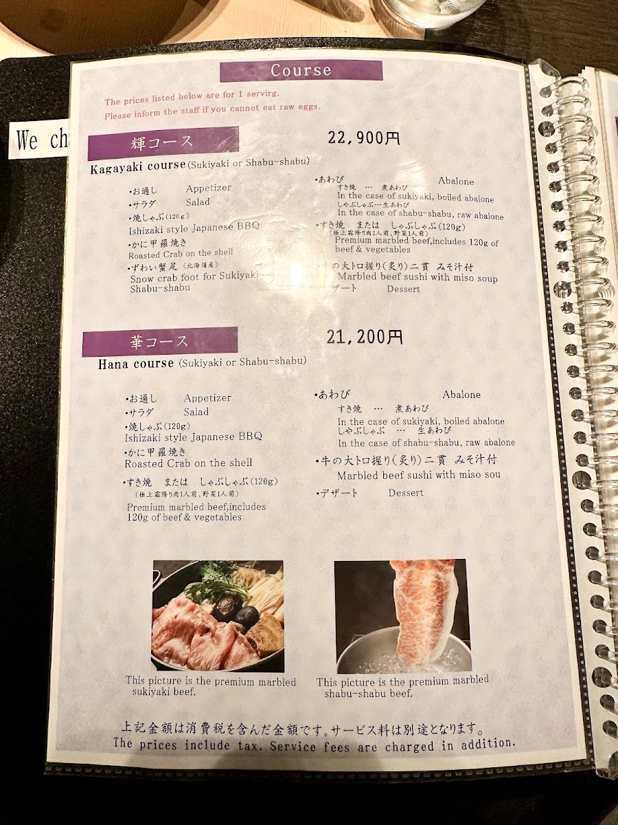 ・お通し・サラダ・焼しゃぶ(一人前120g)・かに甲羅焼き(ズワイガニのむき身と味噌だけを甲羅で焼いたもの)・あわび(すき焼きには「煮あわび」、しゃぶしゃぶには「生あわび」)・ずわい蟹足[北海道産]・鍋料理(すき焼またはしゃぶしゃぶ)極上霜ふり肉 一人前120g・野菜一人前・牛の握り(炙り)2貫・みそ汁付・デザート ※サービス料別途10% ※10名様以上のご予約は、前日の23:00までにお願いいたします。 ※祝日の最終入店は20:00までとなります。 ※1名様よりご予約可能です。